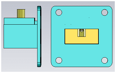In the beginning, a model of the prototype is designed in CST Studio Suite 2022 (CST). As a reference, a WR90 waveguide and a SMA connector are given. For the waveguide, polycarbonate is chosen as the housing material and copper is chosen as conductive layer. For the coaxial port, a SMA-connector (SC7505 Data Sheet2024) from the supplier Fairview Microwave is chosen. The designated connector is reconstructed as a perfect electric conductor (PEC) according to the required dimensions and properties based on the available datasheet and 3D model. To reliably fix the coaxial cable to the hollow waveguide, a mechanical embedding is proposed in which the coaxial cable is inserted and secured with a plastic cover. A first simulation is carried out using a frequency domain solver, which logically provides poor values for the S-parameters due to the lack of adjustment. The construction of the completed simulation model can be seen in Fig. 1. The metallized plastic housing is indicated by cyan color and is first modeled with PEC to suppress losses and to show the general functionality. In order to achieve a suitable transformation of the impedance of the coaxial cable to that of the waveguide, a PCB-based matching element shall be used which can be seen (rectangular element with brown and white color) in the middle of the waveguide transition on the right side of Fig. (1). In conventional waveguide-to-coaxial transitions, these are components attached to the inner conductor of the coaxial cable in the form of steps (Simone et al.2021) or protruding probes as performed in Bialkowski (1995). Since the manufacturing process aims to reduce overall costs, a matching element in the form of a planar transmission line is designed. The size and dimensions of the circuit board are optimized in CST using parameter sweep and manual optimization.
