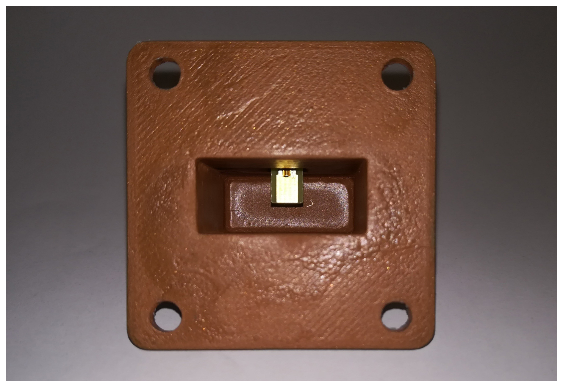 The previously developed coupling element in stripline technology is designed in KiCad and manufactured by Eurocircuits GmbH in Germany. Impurities and unevenness are again manually corrected using a hand file. By applying a fine hand file, the surface roughness can be reduced well below the initial 100 µm level (approx. down to 10–20 µm), although this manual post-processing only improves local surface quality and does not compensate for dimensional offsets or manufacturing tolerances. The strip line is then soldered to the coaxial conductor according to the simulation. At the end, the SMA connector is inserted into the designated opening of the printed waveguide along with the soldered strip line and it is secured in place using the printed sliding cover. Figure 2 displays a finalized prototype.