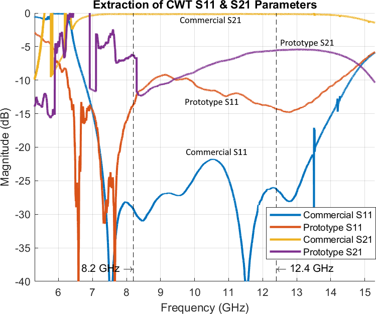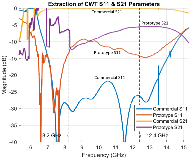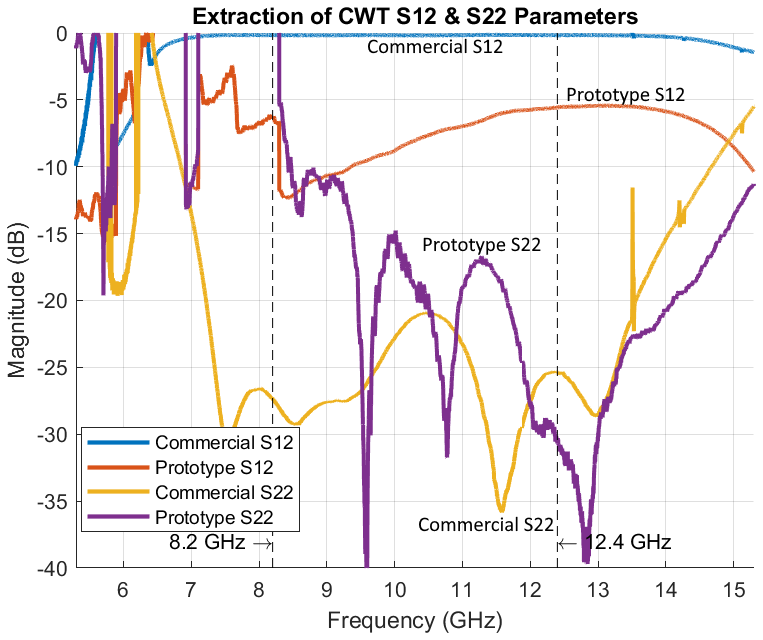 Based on a high precision of the extracted S-parameters of the commercial CWT, another measurement (M3) between the commercial CWT and the manufactured prototype can clearly determine the S-parameters of the supposedly identical prototypes.