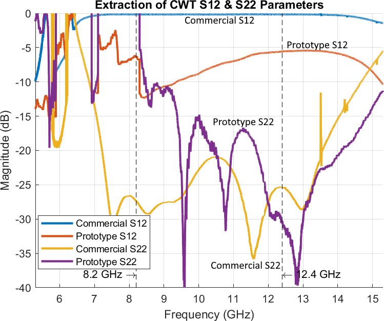 Considering all S-parameters at the beginning of the first third of the frequency spectrum, it is obvious that the extraction method does not work adequately below the cutoff. The reflection and transmission parameters of the extracted commercial CWT meet the VSWR of 1.25:1 and the maximum insertion loss of 0.2 specified by the manufacturer in the X-frequency band. For the prototype, the reflection parameters should be considered individually, as the values greatly differ. While the S11 parameter in the entire X-band only ranges from 9 to 14 dB, the S22 parameter predominantly falls below the 15 dB mark. The transmission parameters are, as this is an intrinsic property of a reciprocal (i.e. commonly passive) network, identical to each other according to the extraction method performed in the same way, and they range from 12.5 to 5.5 dB in the X-band. Before a conclusion is drawn about the prototype, it is necessary to revisit one of the fundamental prerequisites of the methodology, symmetry of the test setup. The solution to the equation systems is based on the fact that the combined measured CWT are exactly identical and therefore assign the same S-parameters.