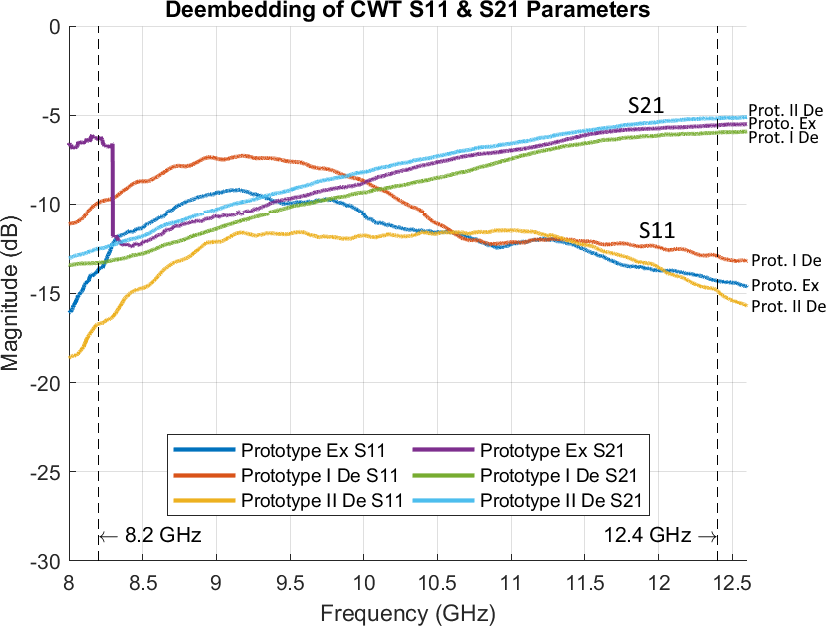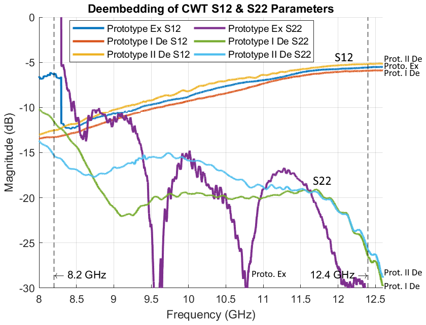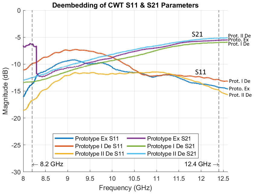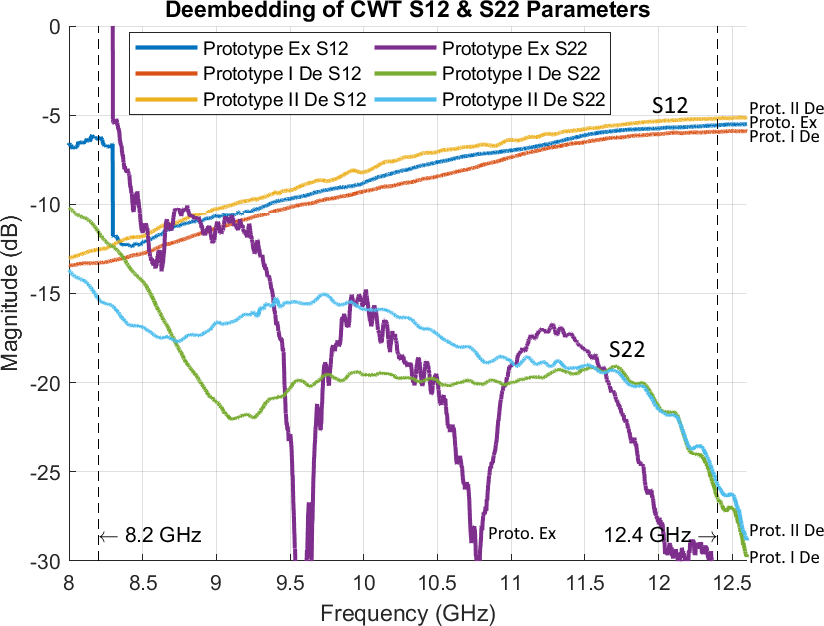 This applies to commercial CWT under the assumption of machine manufacturing techniques and the use of high-quality materials, but not to the prototypes. To obtain unambiguous results for the S-parameters of prototypes, they must be deembedded once again.