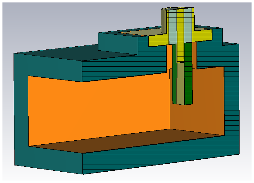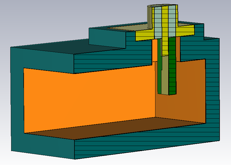 The next step involves transferring the scheme of previously developed low-cost WR90 prototypes to other waveguide standards, using the example of the WR187 standard. The starting point for the development of adapted prototypes for other frequency bands is a predecessor model of the WR90 CWT designed in CST. It consists of the housing made of 30 µm thick copper, covered by the shell of polycarbonate, the SMA connector with a line resistance of 50Ω, a protruding inner conductor and a rectangular contact surface. It also includes the previous self-developed coupling element in strip conductor technology. The described model shows Fig. 7 in cross-section.