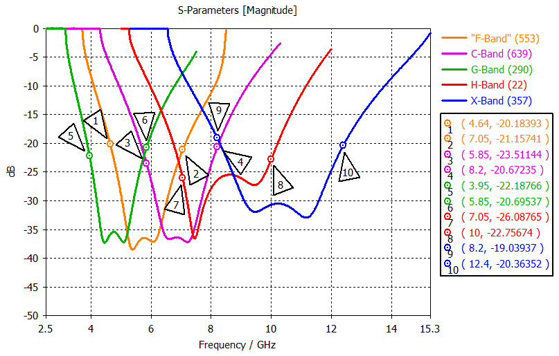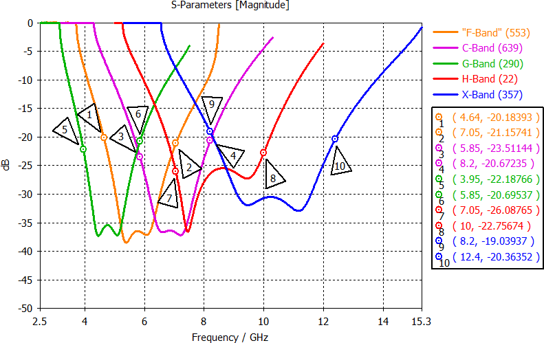 Upon transitioning from the X-Band of the WR90 waveguide to the G-Band of the WR187 waveguide, three more frequency bands - H-Band, C-Band, and F-Band – are traversed, as specified by the manufacturer of Millimeter Wave Products (Waveguide Data Sheet2024). The process of transferring waveguide standards into each other is done by changing the dimensions of the waveguide part proportionally to the wavelength, followed by the similar adaptation of the coupling elements in strip line technology. The measures to ensure impedance matching in the new frequency ranges are based only on variations in length, position and impedance transformation of the coupling element, similar to those in Dewantari et al. (2019) as a variation in PCB substrate thickness is not possible. The performance of the coupling element is again optimized by a parametric study in CST MWS. The simulation results for different waveguide standards is shown by the S11 parameters exemplified in Fig. 8.