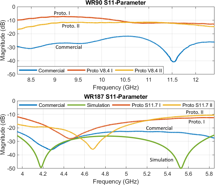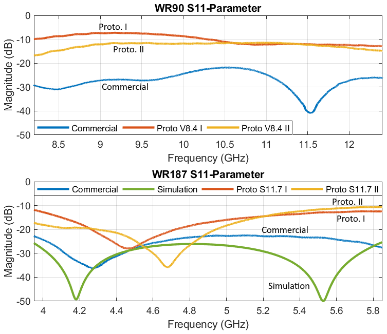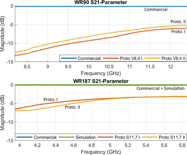 Further, based on the modeling and simulation of the WR90 prototype, it is possible to adapt this model to even larger waveguide standards to improve the transmission. The results of the WR187 prototypes show improvements in both – reflection and transmission – parameters which are attributable to the influences of larger dimensions and lower frequencies which means lower losses. In line with the WR90 prototypes the differences between the simulated and commercial to the measured WR187 prototype S-parameters can once again be attributed to inaccuracies in manufacturing and insufficient quality of the copper spray.