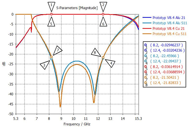 The original WR90 model presented at the beginning is technically modified in a modular design, but still retains its basic form. The only modifications are the new addition of the cover to the flange and the removal of the old guide rails. As the model in the area of wave propagation has remained fundamentally the same, a new simulation of the S-parameters can be started directly by simply changing the conductor material to aluminum. The result of the new S-parameters differs little compared to the previous model with copper as shown in Fig. 12. This fact can be explained by the very good conductivity of aluminum with κAlu36×106 S m−1 (Kark2020) or according to the International Annealed Copper Standard (IACS) ≈64 % of copper conductivity.