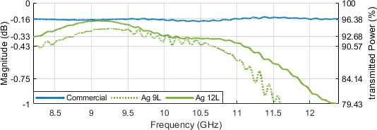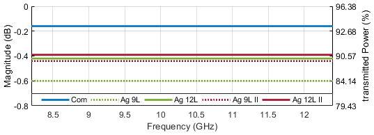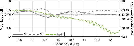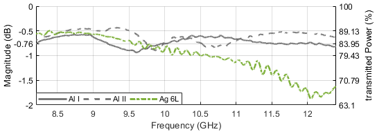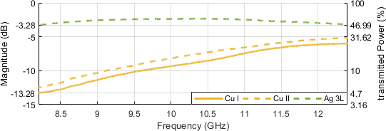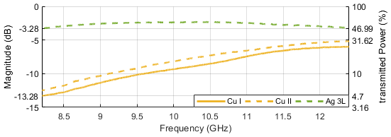 Figure 18 contains a comparison of the preceding Copper samples with a three-layer silver coated DUT, indicating a flattened frequency response and generally a better power acceptance in the range of around 50 %. This is indeed still far below the performance of the aluminum cladded sample which was at more than 80 % accepted power. With a total number of six silver conductive layers being applied, the transmission, as per Fig. 19, Ag 6L, is now close to the performance of the aluminum cladded samples, at least within the X band fraction between 8.2 and 10.5 GHz. Insertion loss rolls off to about 1.5 dB at 11.75 GHz.