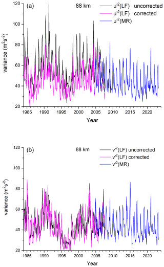 LF and MR winds and thus resulting variances have been obtained by quite different methods. Therefore, we expect that variances obtained by the two methods differ. In particular, meridional LF winds show a bias towards smaller amplitudes (Jacobi et al., 2009). Here we did not perform a mean wind correction such as, e.g., in Jacobi et al. (2015), but directly corrected the variances based on their comparison during the period of overlapping measurements from August 2004 to August 2007. We made a comparison of LF MR variances for each month, and for each height gate separately. This was necessary because in particular in summer there were data gaps during daylight hours, and only few observations were made at lower heights (see Fig. 1). Furthermore, the diurnal distribution of heights was uneven due to the diurnal lower ionospheric E region change, so that possible diurnal cycles of GW amplitude would lead to different biases at different heights. Furthermore, as has been shown, e.g., by Jacobi et al. (2009), the LF winds at the upper height gates show an increasing negative bias. Finally, spaced receiver observations tend to overestimate zonal winds with respect to the meridional ones, so that the corrections have been made for each horizontal wind component separately. The LF MR bias correction factors are provided in Table A1 in Appendix A. Examples for uncorrected and corrected LF variances at 88 km together with MR values are shown in Fig. 2. Uncorrected zonal LF variances are somewhat larger than MR ones at this height gate, while the meridional components are similar for both methods at that height. From the resulting time series we note a clear seasonal cycle, as well as some interannual and quasi-decadal variability.