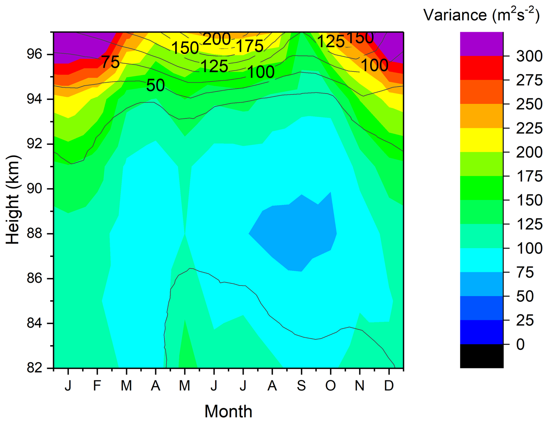The long-term mean variance climatology based on the combined LF and MR dataset is shown in Fig. 3. At altitudes above approx. 88 km, the seasonal distribution is dominated by a winter maximum. Minimum values are seen during equinoxes, and a weak secondary summer maximum is visible. At lower altitudes, the summer maximum exceeds the winter one, which at 82 km becomes very weak. This distribution differs from the one shown by Jacobi (2014a) based on LF observations alone. Their results only included the lower part of the height range, and therefore they found the summer maximum, and only a tendency for the winter maximum at higher altitudes. Furthermore, since Jacobi (2014a) did not apply a correction for the zonal-meridional wind bias (Jacobi et al., 2009), their meridional variances especially at greater altitudes became substantially smaller, without a winter maximum.
