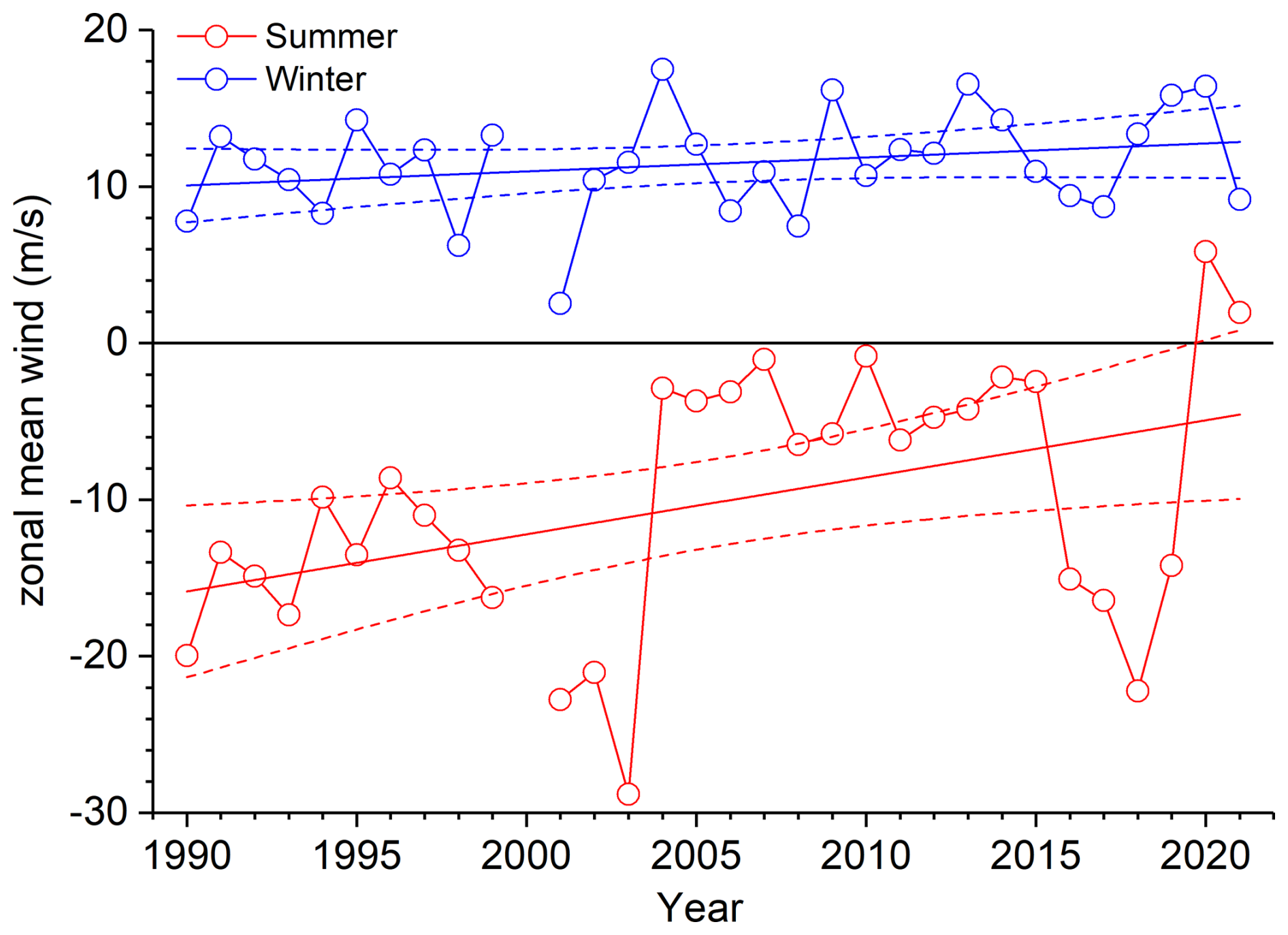 Figure 6Summer (JJA) and winter (DJF) mean zonal winds at about 83 km over Juliusruh. Dashed lines show 95 % confidence bands according to a t-test from Jacobi et al. (2023).